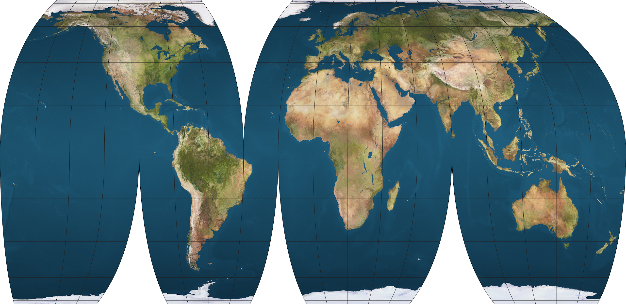 Then, cut and shift the parts to line up: The bottom left part is composed of longitudes -180..-100 and latitudes 0..-90, and projected with a center longitude of -160. The next part is longitudes -180..-40 and latitudes 0..90, projected w/ a center of -100. And so on (the example I linked was pretty intricate & there might be funny business going on in Russia; it doesn’t look like a vanilla sinusoidal there).
