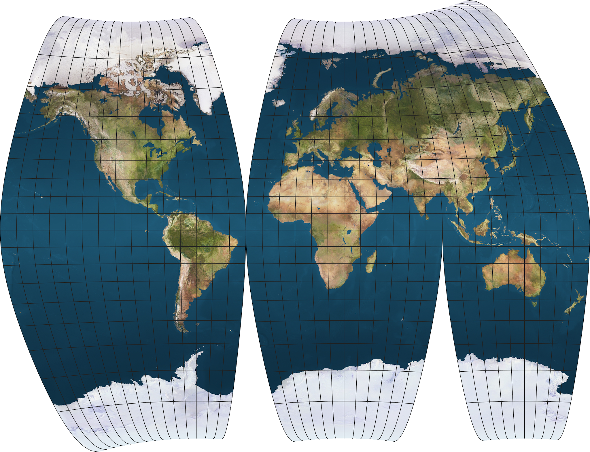 Then, cut and shift the parts to line up: The bottom left part is composed of longitudes -180..-100 and latitudes 0..-90, and projected with a center longitude of -160. The next part is longitudes -180..-40 and latitudes 0..90, projected w/ a center of -100. And so on (the example I linked was pretty intricate & there might be funny business going on in Russia; it doesn’t look like a vanilla sinusoidal there).