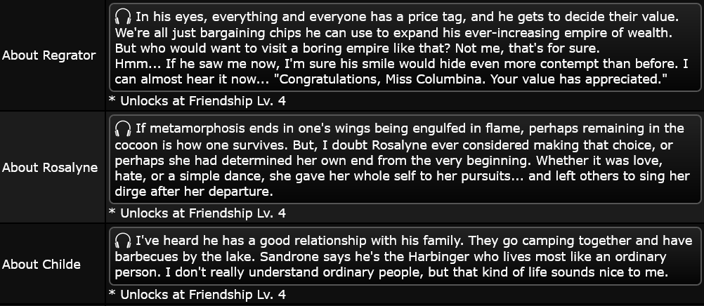 Columbina explicitly ties Rosalyne to a positive value: “It’s important to always express gratitude to others”. That is not something you write about a villain you intend to keep buried, and it’s exactly what “Step 3” of the pity-bait formula looks like: re-contextualizing negative traits by highlighting a sympathetic core. This also means that Arlecchino’s voice line wasn’t a fluke, but rather foreshadowing, and now we’ve got another Harbinger reinforcing the same narrative shift. You don’t just pity-bait her like this and then double down on it years after the fact unless if you’re setting up a payoff.