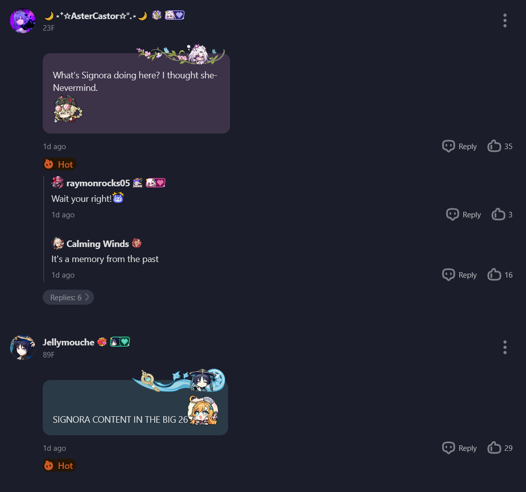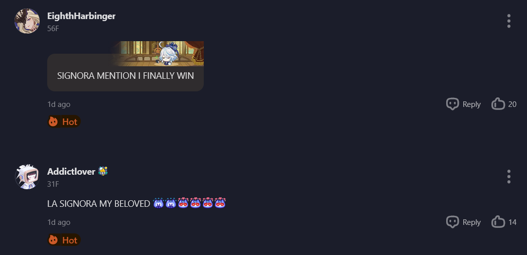 Hell, even the entire comments section about this on the official subreddit was filled with Signora comments, which is a rare sight given how these would normally result in mass downvotes instead. This is even more proof that people DO actually want her, and when Hoyo starts giving them some tangible content like this, discussions about her become more open-minded.