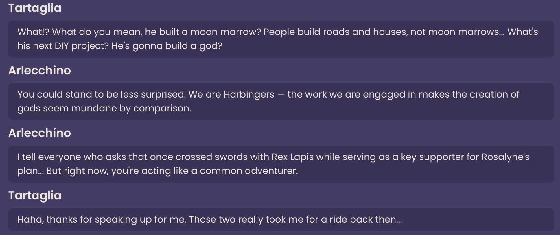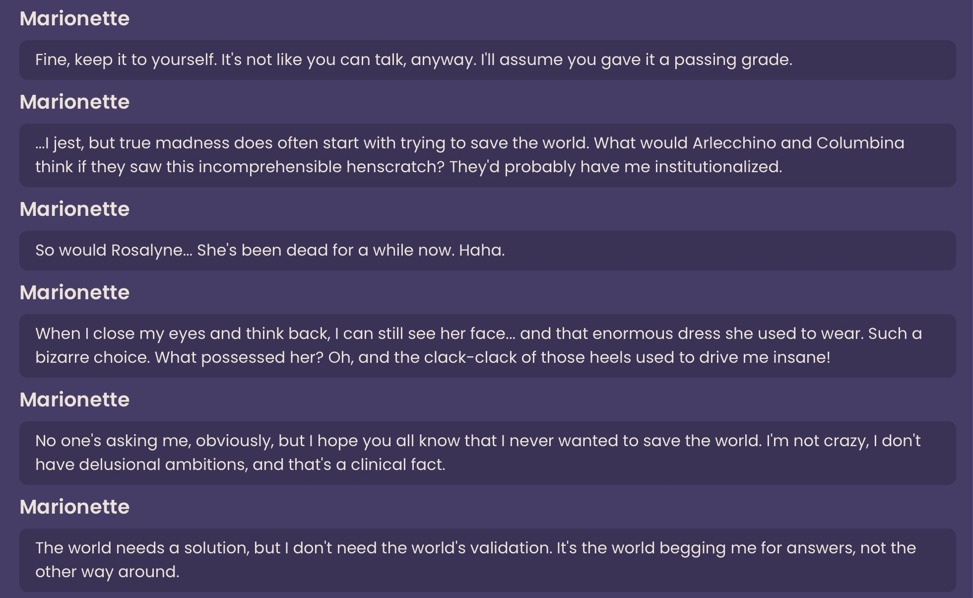 Also, notice how in all instances, they mentioned Rosalyne, not Signora, but refer to other Harbingers by their commedia dell’arte names (Columbina mentioned Arle and Sandrone, while Sandrone mentioned Childe and Capitano). This could be something the developers did to nudge the players into figuring out who “Rosalyne” is, so they’d realize that she’s Signora and get them to read her tragic backstory, likely in an attempt to get the players to understand her past.