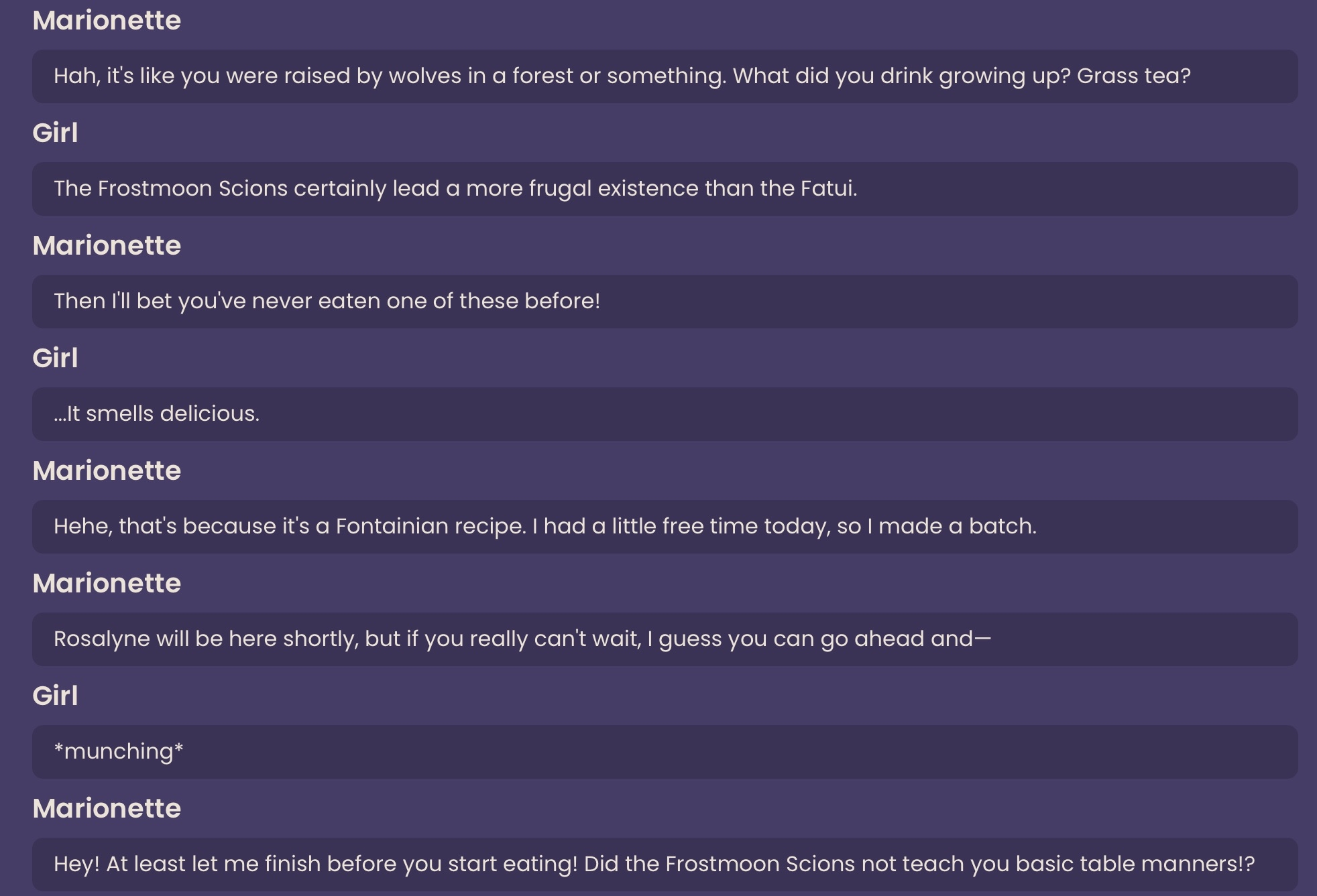 Marionette: First Rosalyne, now you… I’m running out of people who can make me laugh. Honestly, what could be more ridiculous than a multi-centenarian goddess who’s only ever had the plain herbal tea she received as offerings? Heh…