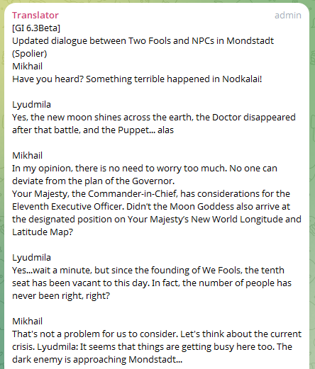 Recently, there’s been an unconfirmed (sus) leak of Mikhail and Lyudmila’s updated dialogue about an approaching abyss invasion in Mondstadt. This is currently unconfirmed as confirmation for future dialogue content will only be available once the preload is out 2 days before the official release, and even after the preload is out, no one has actually dumped the specific text map for this just yet. However, if true, then this not only would make for a good segue to Dornman Port, but it may even give us more Signora lore crumbs, considering how her transformation into the CWOF was driven by the fact that she wanted to purge the monsters and demons out of grief from the loss of her lover. This also reveals that the 10th seat has been empty this whole time, which would further confirm the theory that the alleged “surprise reunion” can’t be the currently unknown 10th Harbinger, and that it’s likely it would be Signora instead.