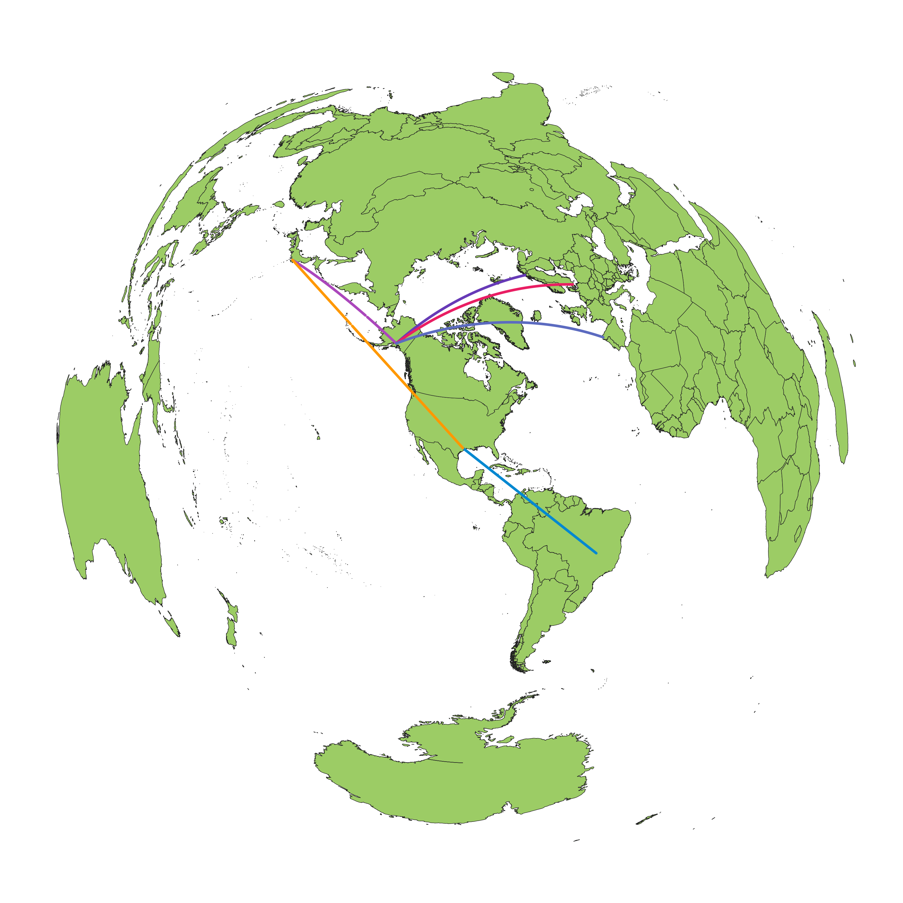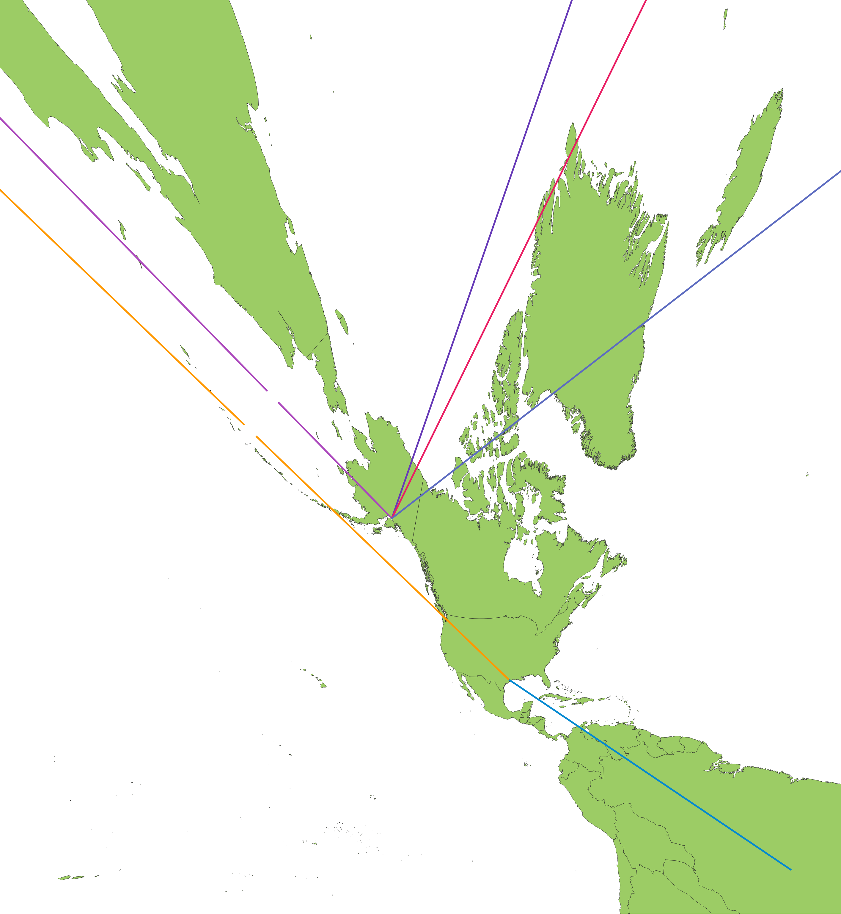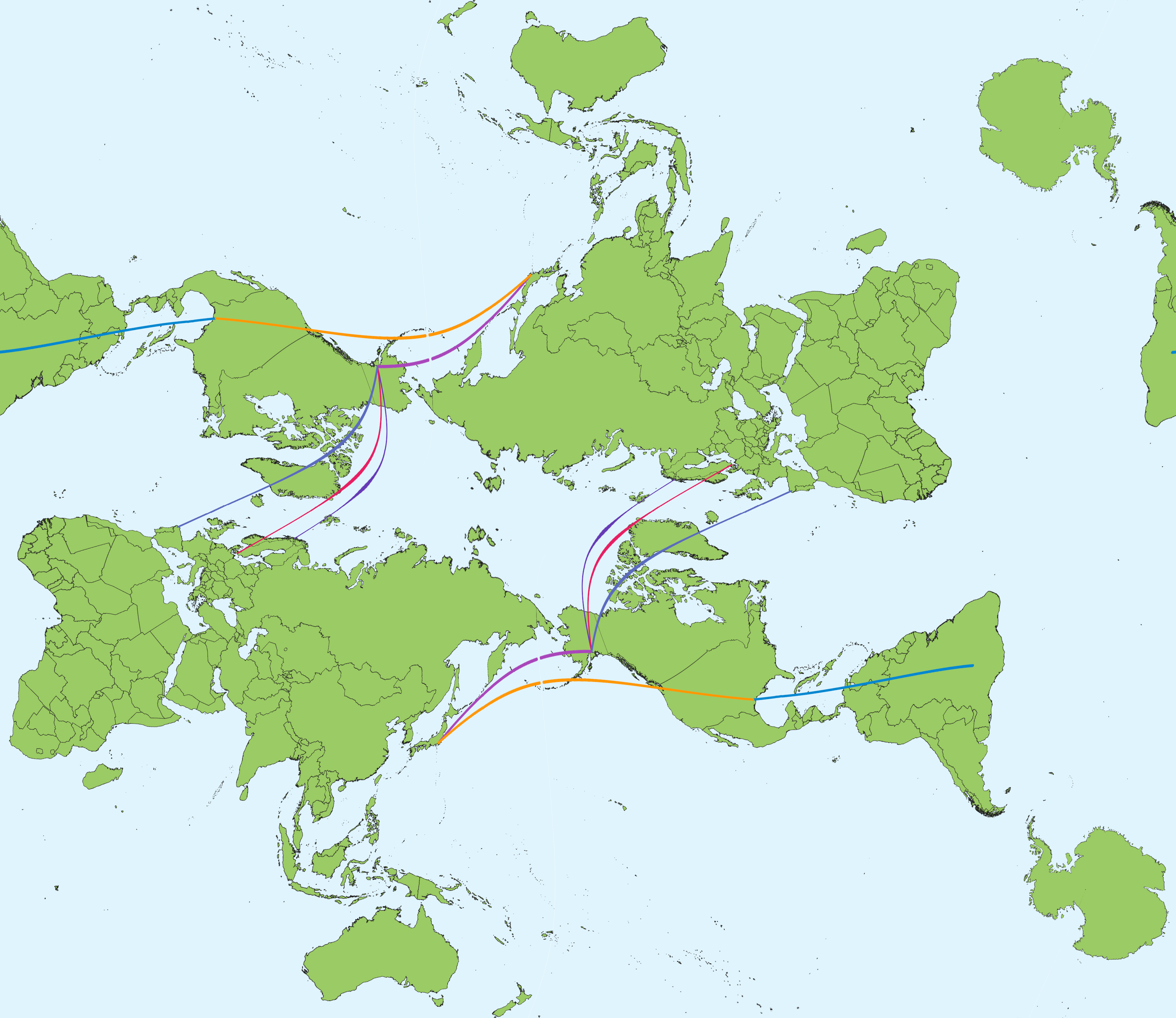 Again, a gimmicky application, and an inappropriate use of this map projection. This image, unlike the previous “flight path” example, actually shows the great circle paths as irregular curves, which makes it unsuitable for this application. Using the Mercator projection that’s tiled horizontally would’ve been *ironically* better than this projection as at least that projection shows great circle paths as sine waves which make more sense.