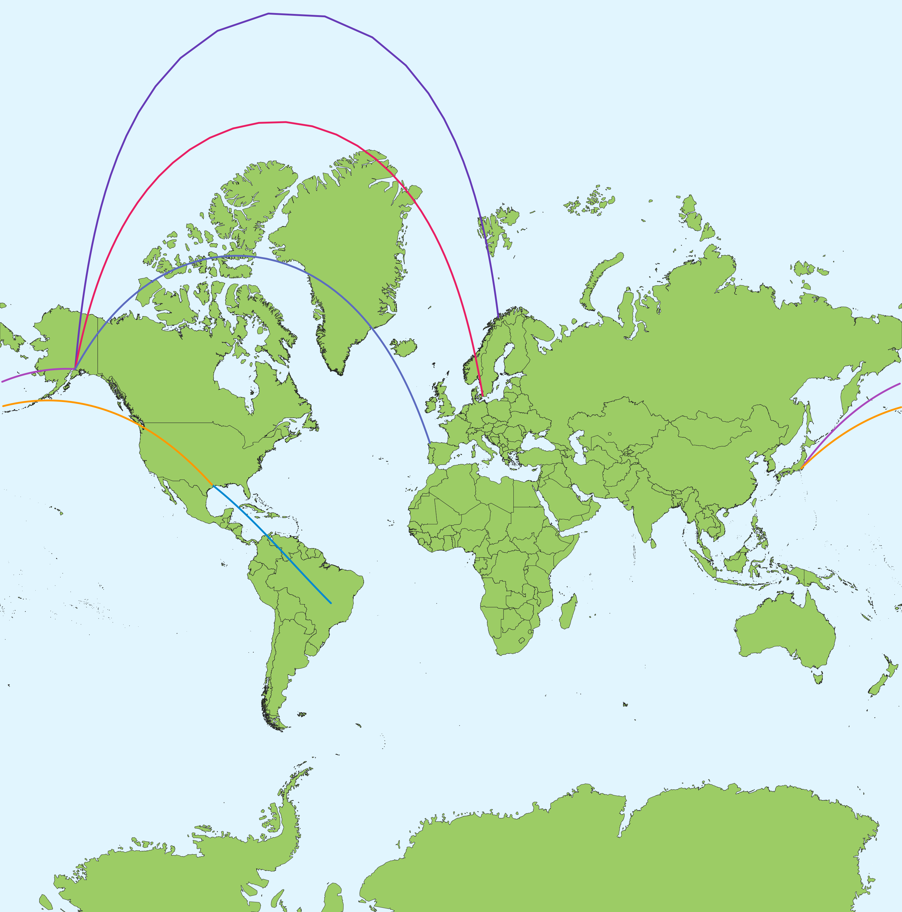 The flight paths in Mercator projection